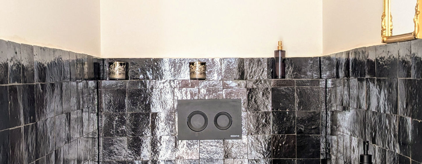 Twee aparte toiletten, afgewerkt met handgemaakte Marokkaanse tegeltjes. Zo hoef je nooit lang te wachten om naar een stijlvol kleinste kamertje te gaan.